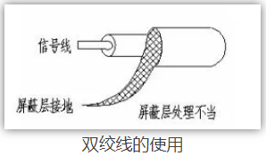 雙絞線、同軸電纜都能有效的抑制電磁干擾。在脈沖信號傳輸線路中常使用雙絞線,控制輔助電源線和傳感器信號線最好用雙絞屏蔽線。因為雙絞線兩根線之間有很 小的回路面積,而且雙絞線的每兩個相鄰的回路上感應出的電流具有大小相等、方向相反,產生的磁場相互抵消,這樣就可以減小因輻射引起的差模干擾,不過雙絞 線絞合的圈數最好為偶數,且每單位波長所絞合的圈數愈多,消除耦合的效果愈好。使用時注意雙絞線和同軸電纜兩端不能同時接地,只能單端接地,而對屏蔽線, 屏蔽層兩端接地能既能屏蔽電場還能屏蔽磁場,單端接地只能屏蔽電場。使用同軸電纜時還要注意,其屏蔽層必須完全包覆信號線接地,即接頭與電纜屏蔽層必須 3600搭接,才能有效屏蔽電磁場,如圖所示,信號線裸露部分仍可以與外界形成互容耦合,降低屏蔽效能。