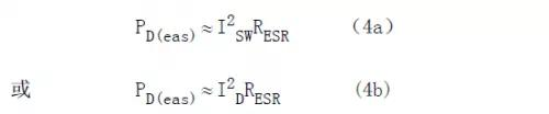 輸入輸出電容是功率開關或輸出整流器產生的高頻電流的唯一來源(或儲存處),所以通過觀察這些電流波形可以合理地確定流過這些電容ESR的電流。這個電流不可避免地在電容內產生熱量。設計濾波電容的主要任務就是確保電容內部發熱足夠低,以保證產品的壽命。式(4)給出了電容的ESR所產生的功率損耗的計算式。