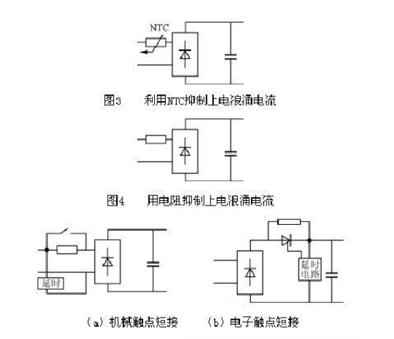 約束上電浪涌最有效的辦法是,在整流器與濾波電容器之間,或在整流器的輸入側加一負溫度系數熱敏電阻(NTC),如圖3所示。使用負溫度系數熱敏電阻在常溫狀態下具有較高阻值來約束上電浪涌,上電后因為NTC流過電流發熱使其電阻值降低以減小NTC上的損耗。這種辦法雖然簡略,但存在的問題是約束上電浪涌性能受環境溫度和NTC的初始溫度影響,在環境溫度較高或在上電時間間隔很短時,NTC起不到約束上電浪涌的效果,因而,這種約束上電浪涌方法僅用于價格低廉的微機電源或其他低成本電源。而在彩色電視機和顯示器上,約束上電浪涌則選用串一限流電阻,電路如圖4所示。最常見的使用是彩色電視機,這種辦法的優點是簡略,可靠性高,允許在寬環境溫度范圍內作業,其缺陷是限流電阻上有損耗,降低了電源效率。事實上整流器上電處于穩態作業后,這一限流電阻的限流效果已完結,僅起到耗費功率、發熱的負效果,因而,在功率較大的開關電源中,選用上電后經必定延時后用一機械觸點或電子觸點將限流電阻短路,如圖5所示。這種約束上電浪涌方法性能好,但電路復雜,占用體積較大。為使使用這種抑制上電浪涌方法,象僅僅串限流電阻相同方便,本文推出開關電源上電浪涌抑制模塊