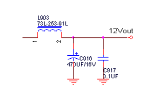 因?yàn)檩敵?/span>干擾的頻譜相當(dāng)豐富,從幾十赫茲到幾十兆赫茲均含分量。因?yàn)樵诟哳l的情況下,濾波電容等效由純電容(C)、等效串聯(lián)電阻(RES)和等效串聯(lián)電感(LES)構(gòu)成的串聯(lián)電路。在作業(yè)頻率f超過電容器的自諧振頻率fr時,電容器就起到電感的作用。值大的濾波電容對低頻干擾比較敏感,相反,值小的濾波電容吸收高頻干擾的作用比較好。因此不能光采用大電解電容濾波C916,還有必要加接自諧振頻率很高的陶瓷電容器C917。