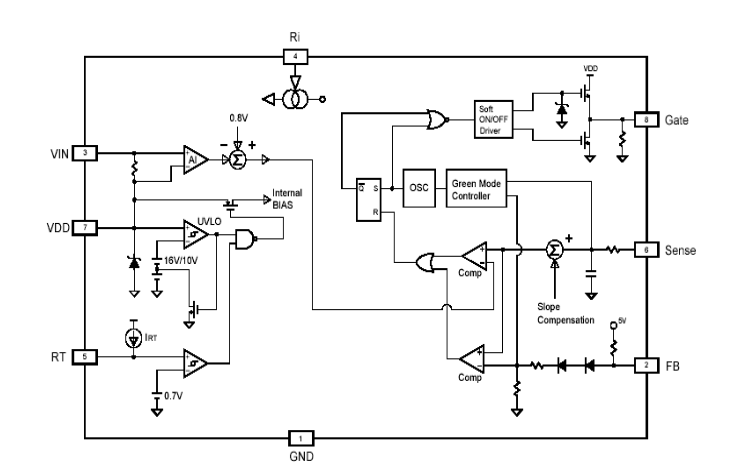 7.具有圖騰柱(即推拉輸出電路)輸出極,可完成杰出的EMI。其最大輸出電壓鉗位在18V。