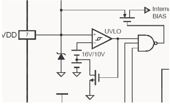 SG6841采用了欠壓鎖定比較器來確保輸出級被驅(qū)動之前,集成電路已完全可用。欠壓鎖定回路其實(shí)質(zhì)是一個滯回比較器,以防止在通過它們各自的門限時產(chǎn)生過錯的輸出動作。它的開啟電壓為16V,關(guān)閉電壓為10V。在啟動過程中,比較器反向輸入端為16V,當(dāng)VDD<16V時,比較器輸出為低電平,SG6841無法工作。當(dāng)VDD升到16V時,欠壓鎖定器輸出為高電平,SG6841正常工作,同時MOS管導(dǎo)通,使比較器反向輸入端為10V。當(dāng)VDD下降至10V時,欠壓鎖定器的輸出回到低電平,整個電路停止工作.SG6841的7腳端設(shè)置了一個32V的齊納二極管,確保內(nèi)部電路肯定工作在32V以下,以防電壓過高損壞芯片。