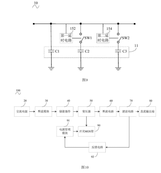 1.開關(guān)電源的起動電路包含:電容電路,電容電路的電容值可調(diào);和與電容電路銜接的調(diào)節(jié)器材,調(diào)節(jié)器材用于在開關(guān)電源上電過程中依照設(shè)定時序調(diào)整電容電路的電容值以改動起動電路的電容值。電容電路包含多個電容,多個電容并聯(lián),調(diào)節(jié)器材包含開關(guān)器材,開關(guān)器材包含與多個電容銜接的至少一個開關(guān)件,每個開關(guān)件與至少一個與電容串聯(lián)。調(diào)節(jié)器材用于調(diào)整可調(diào)電容的電容值。