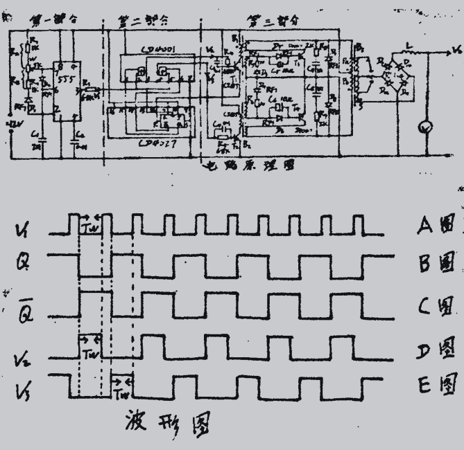 第二部分:這部分是由JK觸發(fā)器CD4027(只用一個(gè)y和四個(gè)輸入或非門CD4001(只用2個(gè))組成。這部分電路完成脈沖信號的邏輯關(guān)系。V作為K觸發(fā)器的時(shí)鐘信號。每當(dāng)時(shí)鐘信號的下降沿到來時(shí)JK觸發(fā)器的Q端和Q端電平都將發(fā)生反轉(zhuǎn)如圖B和圖C。因?yàn)榛蚍情T的2角和5角信號為V1角信號為Q.6角信號為Q,我們知道或非門只有輸人端同時(shí)為低電平時(shí).輸出才為高電平。所以3角輸出波形V如圖D.4角輸出波形V如圖E它們的脈沖寬度為Tw