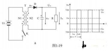 圖1-19-a是反激式變壓器開關電源的簡單作業原理圖,圖1-19-a中,Ui是開關電源的輸入電壓,T是開關變壓器,K是控制開關,C是儲能濾波電容,R是負載電阻。