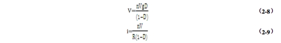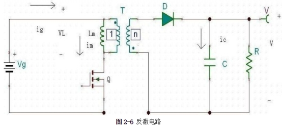 現在來剖析它的作業原理:當Q導通時,二極管截止,根據電路常識可知此刻VL=Vg,ic=-V/R;當Q截止時,二極管D導通,VL=-V/n,ic=i/n-V/R。由伏秒平衡和電容充放電平衡可得: