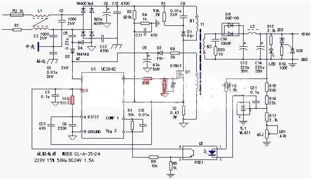 U1芯片和1、2腳外圍元件R7、C12,也是穩(wěn)壓回路的一部分。實(shí)際上,TL1、U1組成了(相對(duì)于U1內(nèi)部電壓差錯(cuò)放大器)外部差錯(cuò)放大器,將輸出24V的電壓改動(dòng)反應(yīng)回U1的反應(yīng)電壓信號(hào)輸入端。