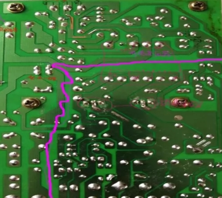 220V交流輸入,通過保險,負溫度熱敏電阻,安規電容,共模電感組成的抗電磁干擾電路及過流保護電路,通過整流二極管整流濾波后輸出300V左右的直流電壓。這是電源板正面圖,用紅線畫出的部分為熱地與冷地部分(開關電源接地方式有熱地和冷地之分,與220V電源直接相連的地稱為熱地,人體直接觸摸會觸電;經開關變壓器阻隔后,再整流濾波后的地稱為冷地,人體直接觸摸不會觸電)。這是電路板反面圖,在圖中標出開關電源的輸入部分、300V濾波大電容、開關管、開關變壓器、肖特基二極管等首要元器材。